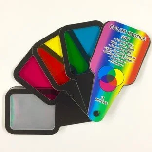 Set of coloured transmission filters and diffraction grating seen in Colour Paddle set. Image courtesy of Maggie Maggio.